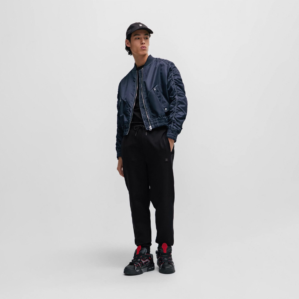 Un bas de survêtement sportif HUGO Homme resserré au bas des jambes, à la coupe décontractée, confectionné en coton stretch et orné d’un logo revisité en métal bruni.