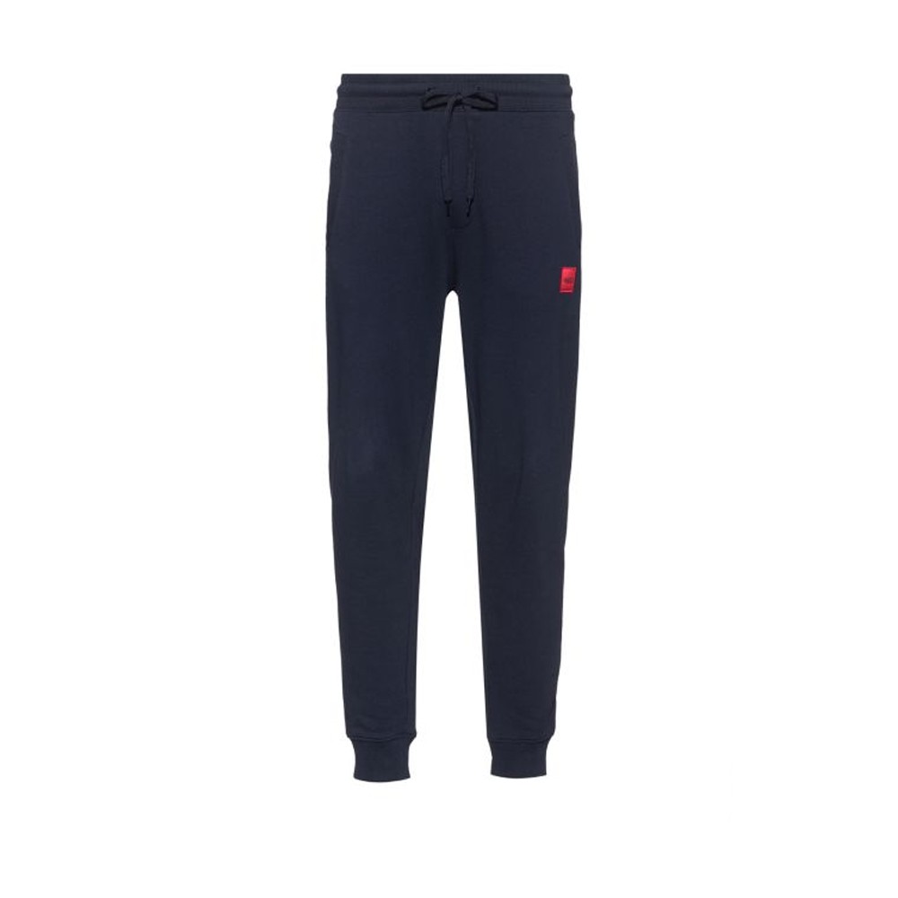 Un pantalon HUGO Homme resserré au bas des jambes affichant un design urbain et une étiquette logo rouge vif. Ce pantalon Regular Fit est confectionné en jersey de coton molletonné. Il est rehaussé d’une taille élastique avec cordons de serrage au style sportif. Les poches passepoilées au dos offrent une fonctionnalité supplémentaire à cet essentiel avant-gardiste.